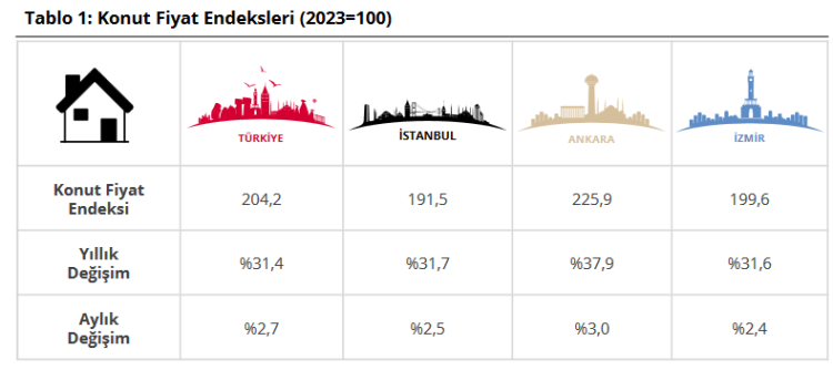 İstanbul, Ankara ve İzmir’de Kasım ayındaki fiyat değişimleri sırasıyla yüzde 2,5, 3,0 ve 2,4 olarak kaydedildi. Geçen yılın aynı ayına göre ise İstanbul’da yüzde 31,7, Ankara’da yüzde 37,9 ve İzmir’de yüzde 31,6 oranlarında artış görüldü.