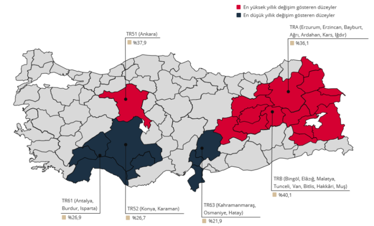 Bölgesel olarak yıllık değişim incelendiğinde, en yüksek artış yüzde 40,1 ile Bingöl, Elazığ, Malatya, Tunceli, Van, Bitlis, Hakkâri ve Muş illerinin yer aldığı bölgede gerçekleşti. Buna karşın Hatay, Kahramanmaraş ve Osmaniye illerini kapsayan bölgede artış yüzde 21,9 ile en düşük seviyede kaldı.
